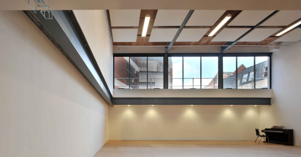 The Get-In and side stage were upgraded to allow for an alternative performance areas, and the existing top floor rehearsal room was altered with new rooflights to provide additional height and with improved acoustic separation to adjoining areas, and the existing paintshop below. A new top floor extension was also added which provided a new modern, bright top lit rehearsal space.